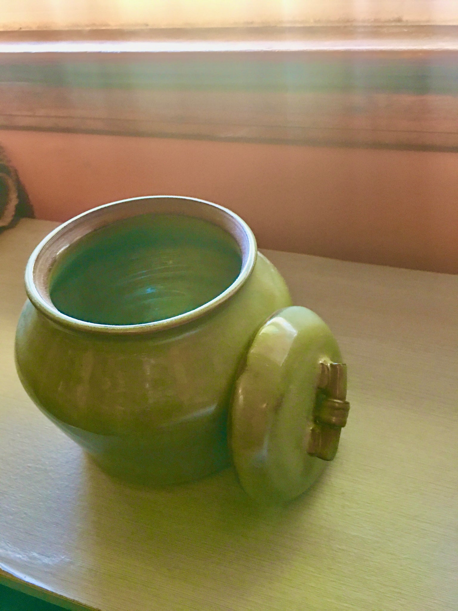 Your home deserves a touch of history and unique charm! This one-of-a-kind vintage sage green glazed ceramic pottery, complete with its detailed lid, is ready to bring peace, joy, and harmony into your space. Imagine this beautiful, pre-loved treasure gracing your mantelpiece, entryway, or kitchen table, telling a story that's uniquely yours. You can create a sanctuary that feels truly you, without breaking the bank.