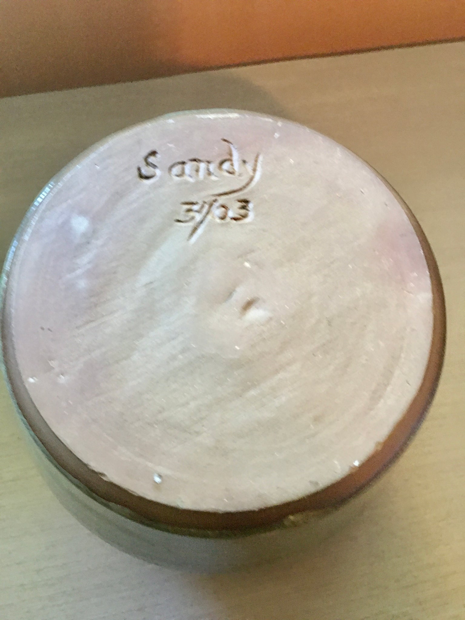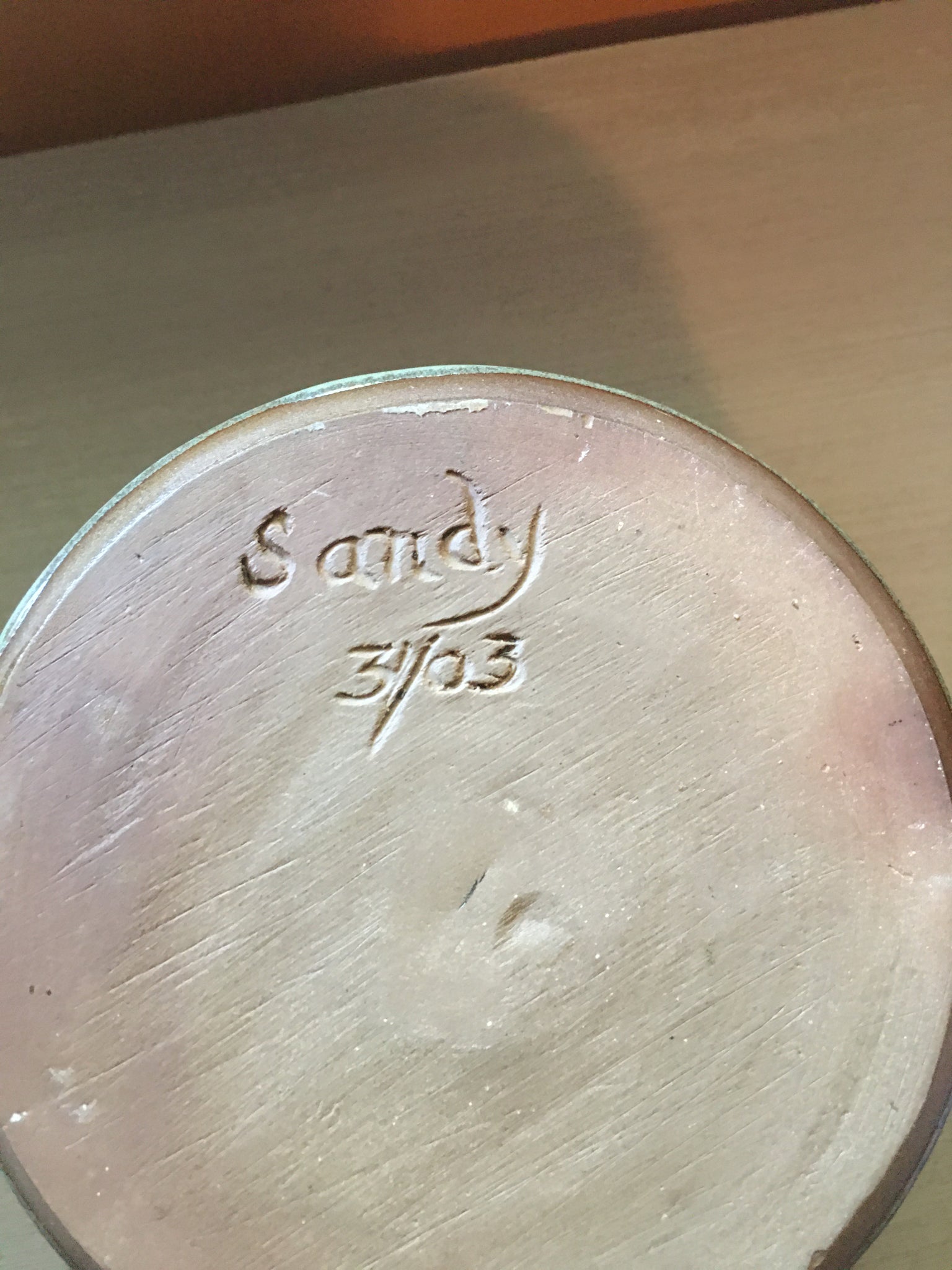 Features: Sage green glazed ceramic, detailed lid, signature on bottom of pot